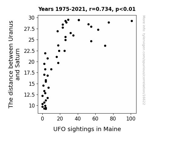 This means 53.9% of the change in the one variable (i.e., UFO sightings in Maine) is predictable based on the change in the other (i.e., The distance between Uranus and Saturn) over the 47 years from 1975 through 2021.