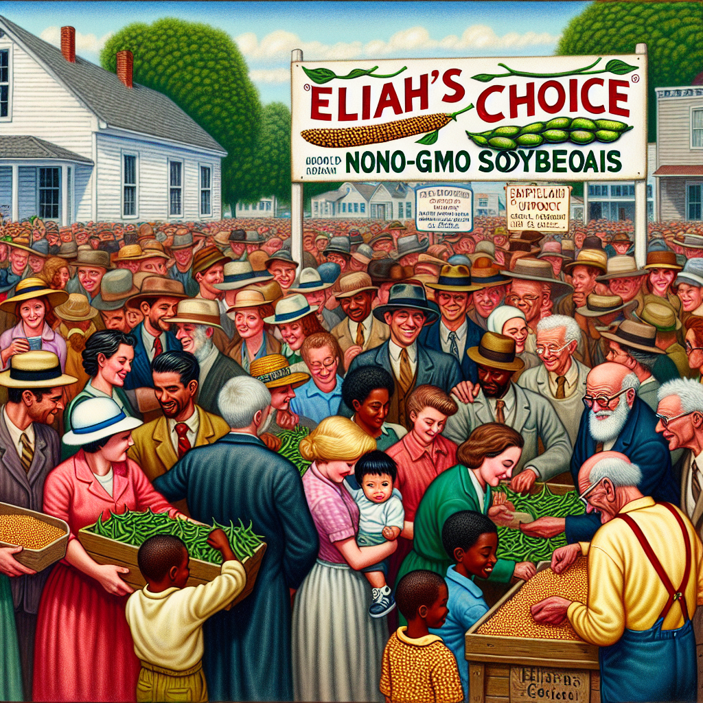 ChatGPT: Generate an image that resembles a scene from a heartwarming Disney movie. Capture a vibrant farmers' market in Indiana with a prominently displayed "Elijah's Choice Soybeans" sign, attracting a bustling crowd of people eagerly lining up to purchase the non-GMO variety. This should evoke a sense of community and unity as the market-goers greet each other while shopping for fresh produce. The image should be rich in colors and details, exuding a warm and friendly atmosphere.