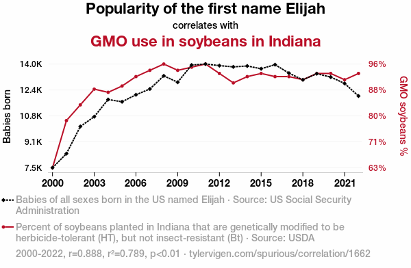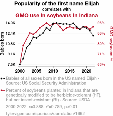 "Elijah Effect" "genetically modified soybeans" Indiana, "Elijah popularity" correlation GMOs, "US Social Security Administration data" "USDA agriculture data" correlation, "Elijah name popularity" GMO soybeans Indiana correlation, "Lighthearted statistical correlations" "Elijah name" agriculture connection