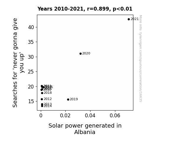 This means 80.8% of the change in the one variable (i.e., Solar power generated in Albania) is predictable based on the change in the other (i.e., Searches for 'never gonna give you up') over the 12 years from 2010 through 2021.