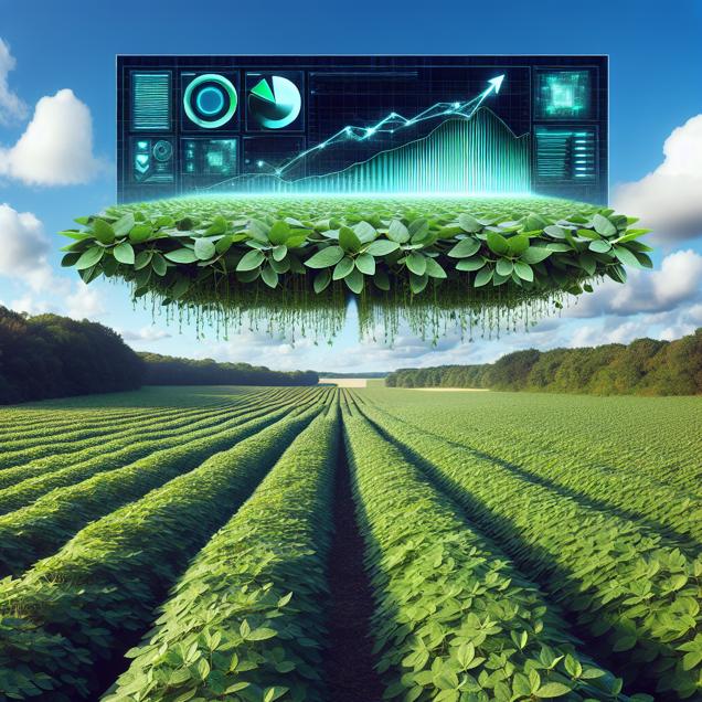 Prompt: Generate an image that showcases photorealism, depicting a sprawling field of lush green soybean plants extending into the horizon. Within the field, there are several plants with visibly large, vibrant "GMO" labels adorning their leaves. Meanwhile, suspended in the sky above the field is a massive digital screen displaying a graph depicting a sharp increase in Google searches for "i can't even." The image should capture the contrast between the natural greenery and the technological display in a visually striking manner. The depiction should include only scenes, people, and objects, it should not include text or speech bubbles.