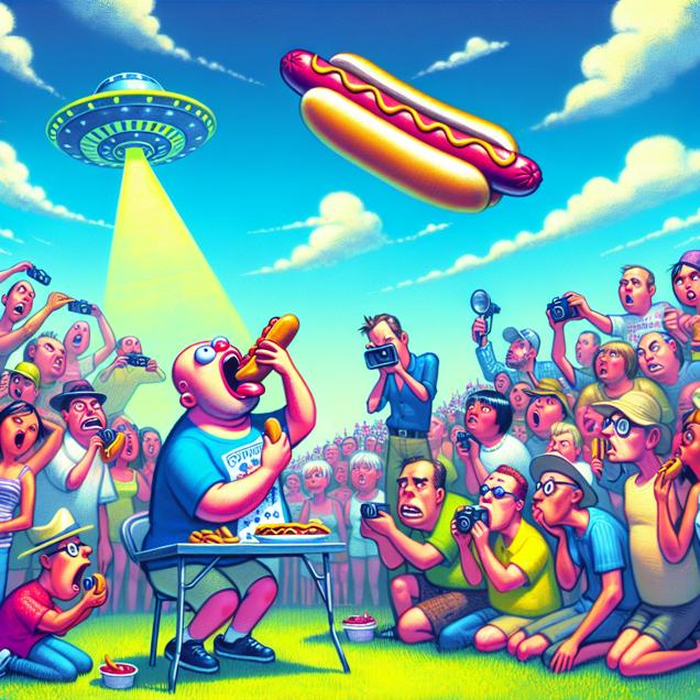 User prompt: Please describe a visual scene that prominently depicts both UFO sightings in Georgia and Hotdogs consumed by Nathan's Hot Dog Eating Competition Champion together. Keep the description simple.