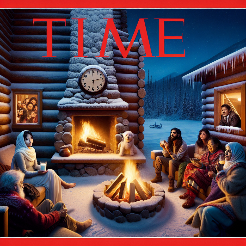 ChatGPT: Generate an image depicting a TIME magazine cover that showcases a peaceful scene in a cozy Alaskan cabin. Inside the cabin, a person sits by the fireplace, sipping a glass of milk while the warm fire crackles. Meanwhile, outside, a small group of people gather around a bonfire, roasting marshmallows and enjoying the winter night. The cover should capture the serene ambiance, with emphasis on the contrast between the warm, intimate interior and the chilly, snowy surroundings.