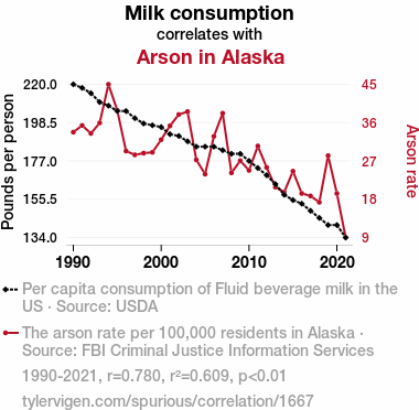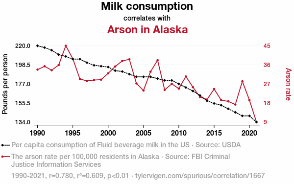 - The spurious research paper: Got Milk? The Unlikely Link Between Milk Consumption and Arson in Alaska