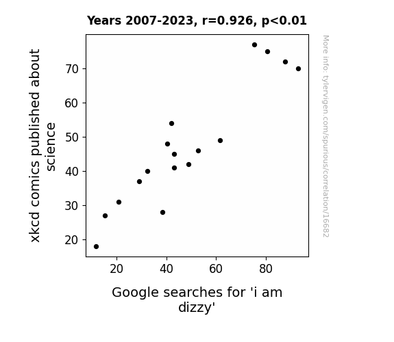 This means 85.8% of the change in the one variable (i.e., Google searches for 'i am dizzy') is predictable based on the change in the other (i.e., xkcd comics published about science) over the 17 years from 2007 through 2023.