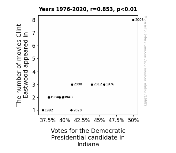This means 72.7% of the change in the one variable (i.e., Votes for the Democratic Presidential candidate in Indiana) is predictable based on the change in the other (i.e., The number of movies Clint Eastwood appeared in) over the 10 years from 1976 through 2020.