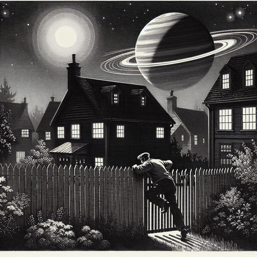 ChatGPT: Generate an image of a serene New Jersey neighborhood at midnight, with a burglar stealthily scaling a fence to attempt a break-in. Above this scene, in the black-and-white newspaper illustration style, let Neptune shimmer in the dark night sky as it orbits at a distant but constant distance from Earth. Emphasize the contrast between the calm suburban setting and the distant, otherworldly beauty of the planet.