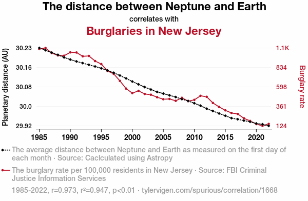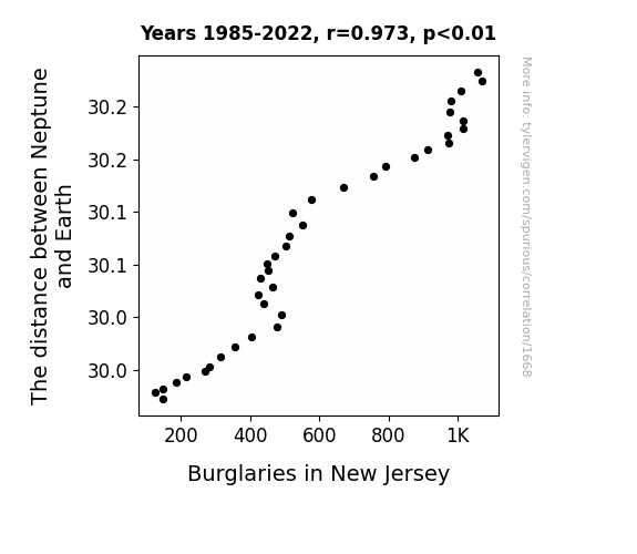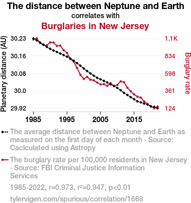 This means 94.7% of the change in the one variable (i.e., Burglaries in New Jersey) is predictable based on the change in the other (i.e., The distance between Neptune and Earth) over the 38 years from 1985 through 2022.
