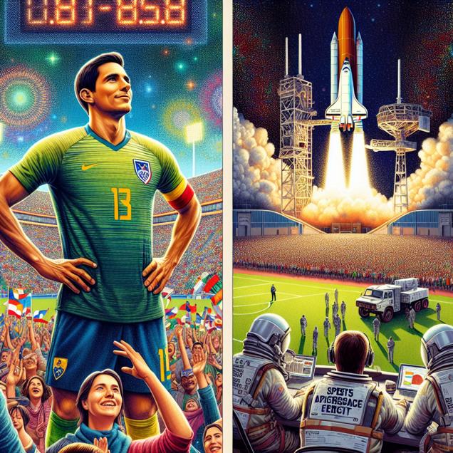 User prompt: Please respond with an image generation prompt that would be likely to create an interesting visual using DALLE-3, using the following style: [ A TIME magazine cover image ] and depicting this scene: Lionel Messi stands on a soccer field, surrounded by cheering fans, proudly displaying the number of goals he has scored for Argentina on a brightly lit scoreboard. Meanwhile, in the clear blue sky above, a group of aerospace engineers in New Mexico work together on a spacecraft, their expertise and determination evident in their focused expressions as they strive to achieve new heights in space exploration. Keep the visual depiction simple. Do not include any words or speech bubbles.