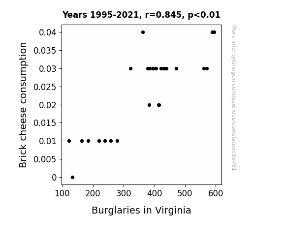 This means 71.5% of the change in the one variable (i.e., Burglaries in Virginia) is predictable based on the change in the other (i.e., Brick cheese consumption) over the 27 years from 1995 through 2021.