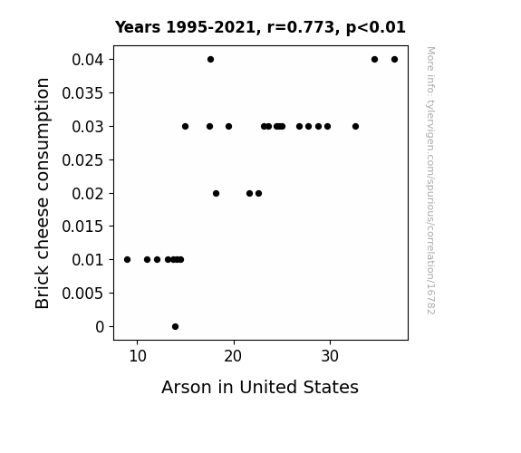 This means 59.7% of the change in the one variable (i.e., Arson in United States) is predictable based on the change in the other (i.e., Brick cheese consumption) over the 27 years from 1995 through 2021.