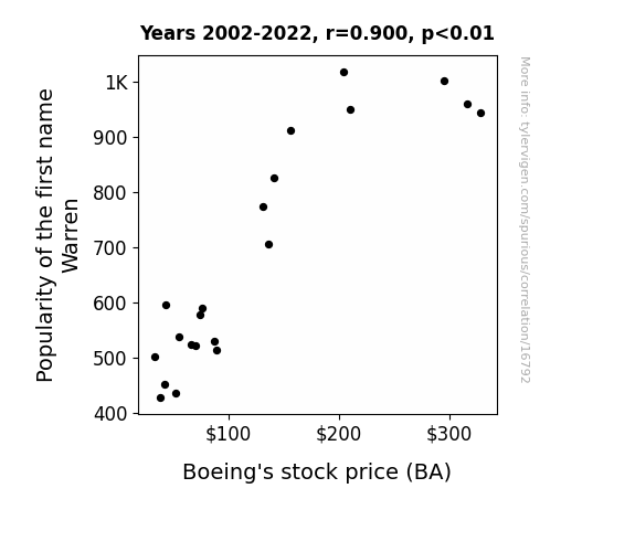 This means 80.9% of the change in the one variable (i.e., Boeing's stock price (BA)) is predictable based on the change in the other (i.e., Popularity of the first name Warren) over the 21 years from 2002 through 2022.