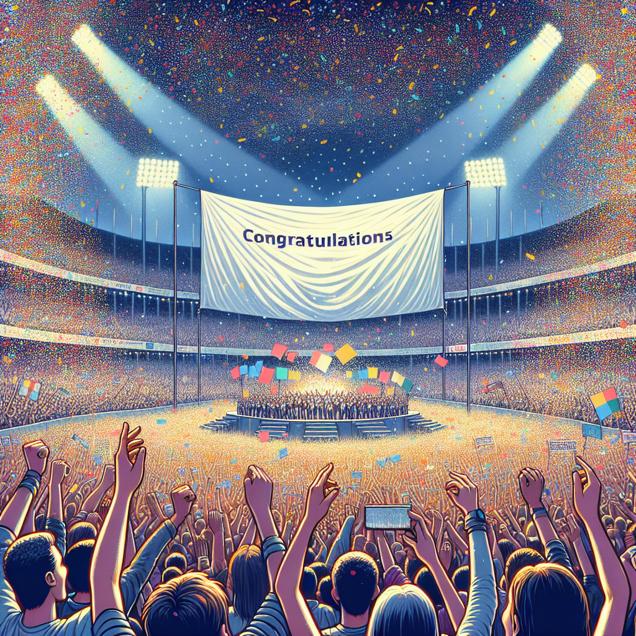 ChatGPT: Generate an image of the grand Super Bowl stadium packed with ecstatic fans cheering in the stands, while a colossal banner unfurls in the center with "Congratulations Krysta!" emblazoned across it. The crowd is awash with jubilation as vibrant confetti cascades from the sky, commemorating the victorious team's groundbreaking 50-point achievement. The joyous atmosphere of the event should be unmistakable, with the energy and enthusiasm of the crowd palpable.