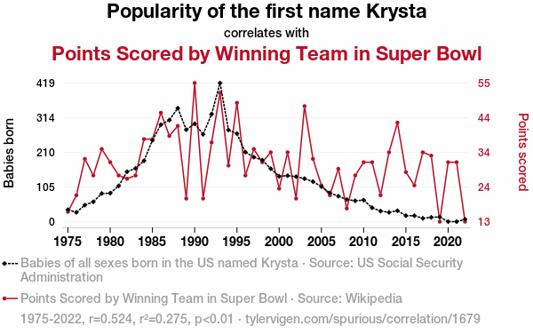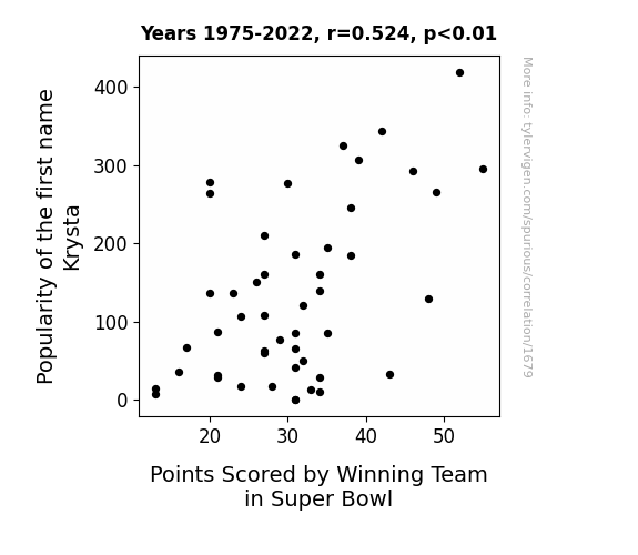 This means 27.5% of the change in the one variable (i.e., Points Scored by Winning Team in Super Bowl) is predictable based on the change in the other (i.e., Popularity of the first name Krysta) over the 48 years from 1975 through 2022.
