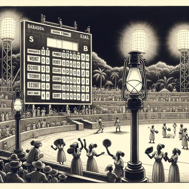 Prompt: Prompt: Generate an image that replicates the style of a classic black-and-white newspaper illustration. Depict a small, lively stadium in Barbados, with a gigantic scoreboard illuminated by kerosene lamps, displaying the final score difference between the winners and runners-up in the NCAA Women's Softball Championship. The bright glow of the kerosene lamps should bathe the proud faces of the winning team as they celebrate their victory, while the runners-up stand in respectful concession of defeat. Keep the visual portrayal straightforward, avoiding any words or speech bubbles. The depiction should include only scenes, people, and objects, it should not include text or speech bubbles.