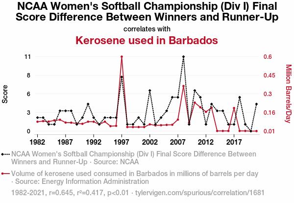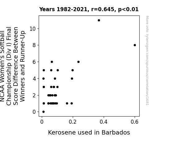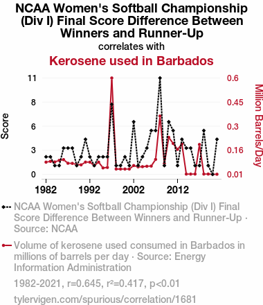 NCAA Women's Softball Championship, Div I, score difference, kerosene consumption, Barbados, correlation coefficient, Energy Information Administration, statistical significance, unusual connection, softball game, kerosene use, offbeat question, NCAA data, EIA data, softball research