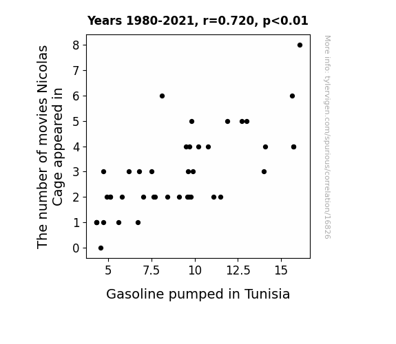 This means 51.9% of the change in the one variable (i.e., Gasoline pumped in Tunisia) is predictable based on the change in the other (i.e., The number of movies Nicolas Cage appeared in) over the 42 years from 1980 through 2021.