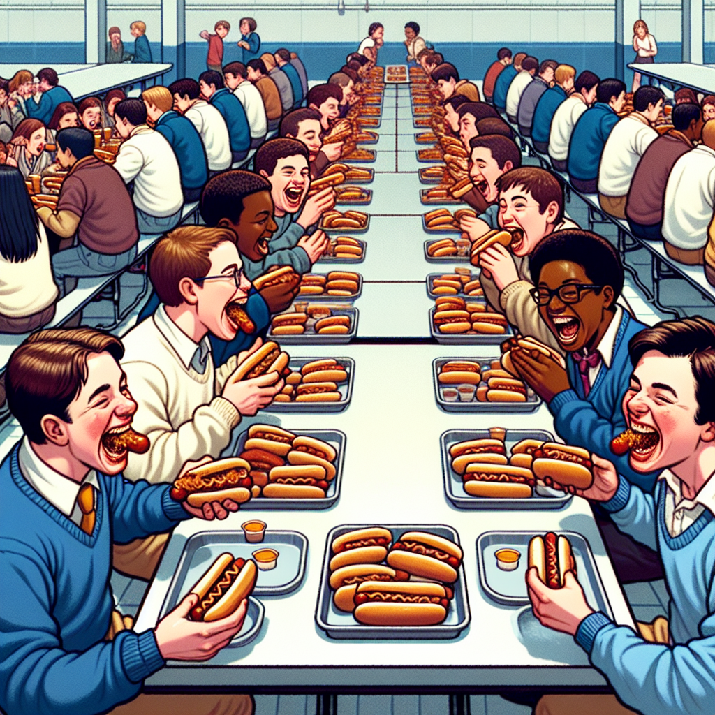 ChatGPT: In a bustling high school cafeteria, a group of 10th-grade students sits at a long table, eagerly eating hotdogs from a Nathan's Hot Dog Eating Competition platter. The number of students enjoying the hotdogs mirrors the number of public school students in 10th grade. The champion of the eating competition is smiling, surrounded by empty hotdog trays, indicative of the impressive number of hotdogs consumed.