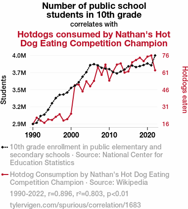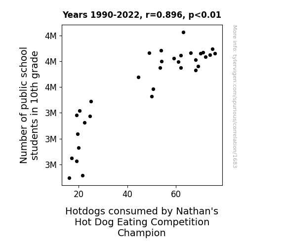 - The spurious research paper: Grade 10 Gastronomy: Exploring the Correlation Between 10th Grade Student Population and Hot Dog Consumption Among Nathan's Hot Dog Eating Champions