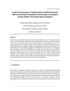 Gastronomy, 10th grade students, hot dog consumption, Nathan's Hot Dog Eating Competition, correlation, National Center for Education Statistics, competitive eating history, school cafeteria, adolescent appetite, academic inquiry, statistical analysis