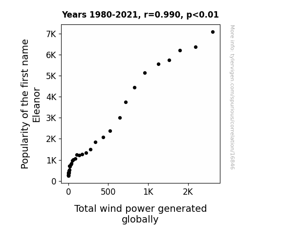 This means 98.1% of the change in the one variable (i.e., Total wind power generated globally) is predictable based on the change in the other (i.e., Popularity of the first name Eleanor) over the 42 years from 1980 through 2021.