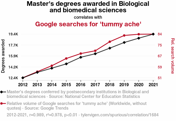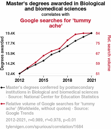 - The spurious research paper: Mastering the Gut Feeling: The Correlation Between Master's Degrees in Biological and Biomedical Sciences and Google Searches for 'Tummy Ache'