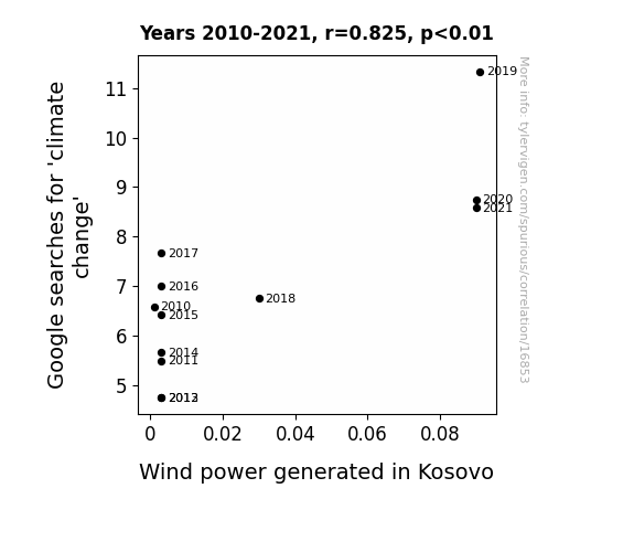 This means 68.1% of the change in the one variable (i.e., Wind power generated in Kosovo) is predictable based on the change in the other (i.e., Google searches for 'climate change') over the 12 years from 2010 through 2021.