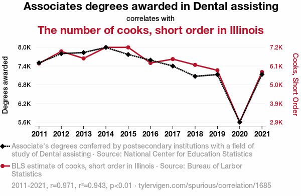 This means 94.3% of the change in the one variable (i.e., The number of cooks, short order in Illinois) is predictable based on the change in the other (i.e., Associates degrees awarded in Dental assisting) over the 11 years from 2011 through 2021.