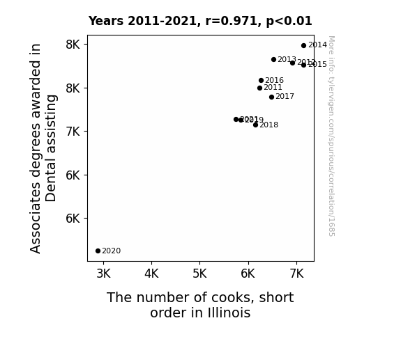 Our journey began with our research team poring over a decade of data, ranging from 2011 to 2021, sourced from the National Center for Education Statistics and the Bureau of Labor Statistics – talk about a statistician's dream buffet. The data revealed a statistically significant correlation coefficient of 0.9712019 and a p-value of less than 0.01, indicating an incredibly strong relationship between the two variables. It appears that the more dental assisting degrees awarded, the more short order cooks found themselves flipping burgers and sizzling up a storm in Illinois. One might say that this correlation is truly en-denture-ingly strong!