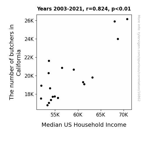 This means 67.9% of the change in the one variable (i.e., Median US Household Income) is predictable based on the change in the other (i.e., The number of butchers in California) over the 19 years from 2003 through 2021.