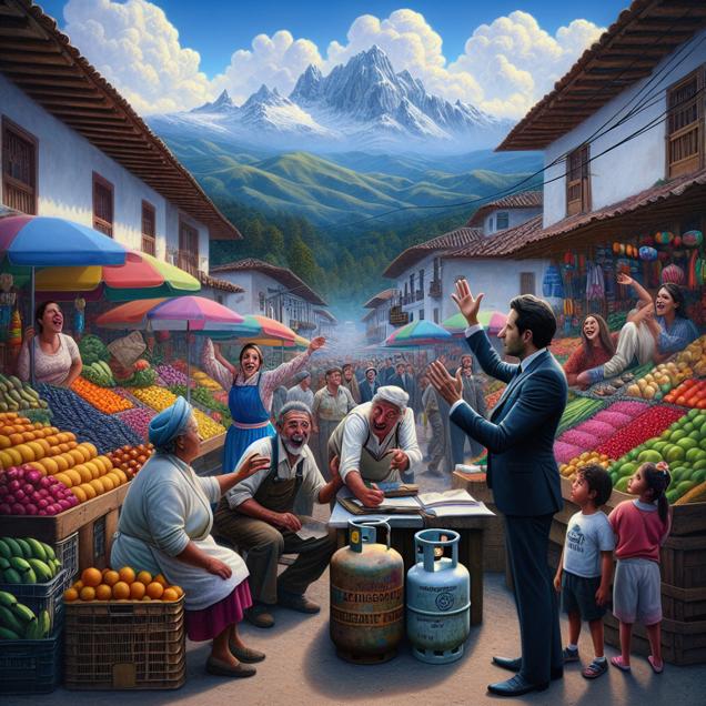 ChatGPT: In a small Colombian town, an outdoor market bustles with activity. A vendor sells colorful fruits and vegetables while next to him, a smiling family purchases a tank of liquefied petroleum gas. In the background, a group of university students gather around an associate professor, who is discussing a topic with enthusiasm. The professor, dressed in a neat shirt, pauses to greet a colleague as they walk by. In the distance, a lush mountain range provides a picturesque backdrop to the scene.