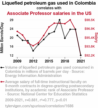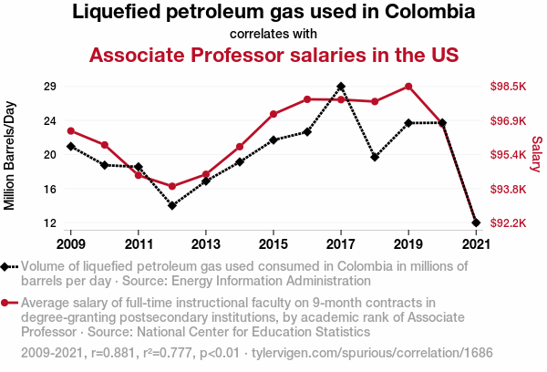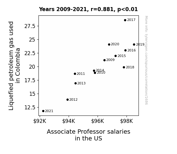 This means 77.7% of the change in the one variable (i.e., Associate Professor salaries in the US) is predictable based on the change in the other (i.e., Liquefied petroleum gas used in Colombia) over the 13 years from 2009 through 2021.