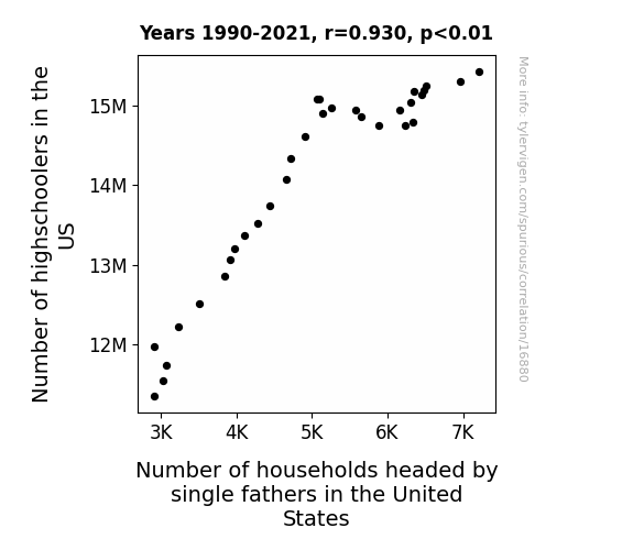This means 86.5% of the change in the one variable (i.e., Number of households headed by single fathers in the United States) is predictable based on the change in the other (i.e., Number of highschoolers in the US) over the 32 years from 1990 through 2021.