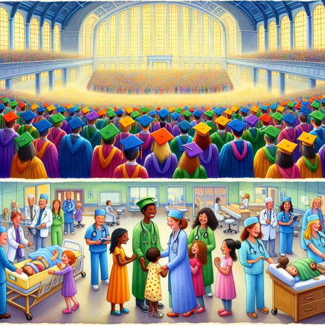 Prompt: [Whimsical illustration] In a vibrant and airy university hall, a jubilant group of graduates, clad in colorful caps and gowns, proudly display their Bachelor's degrees in Liberal Arts. In the foreground, smiling pediatricians engage in heartwarming interactions with cheery little patients, surrounded by the cheerful hustle and bustle of a charming Massachusetts children's hospital. The depiction should include only scenes, people, and objects, it should not include text or speech bubbles.