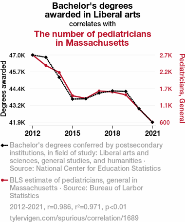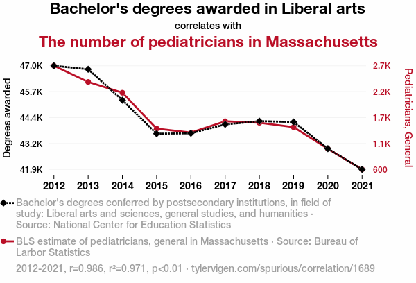 This means 97.1% of the change in the one variable (i.e., The number of pediatricians in Massachusetts) is predictable based on the change in the other (i.e., Bachelor's degrees awarded in Liberal arts) over the 10 years from 2012 through 2021.