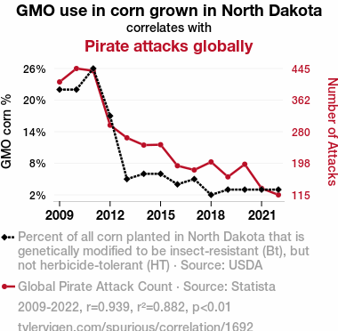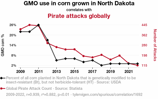 - The spurious research paper: Shiver Me Corn-ters: The Corny Connection Between GMOs and Global Pirate Attacks
