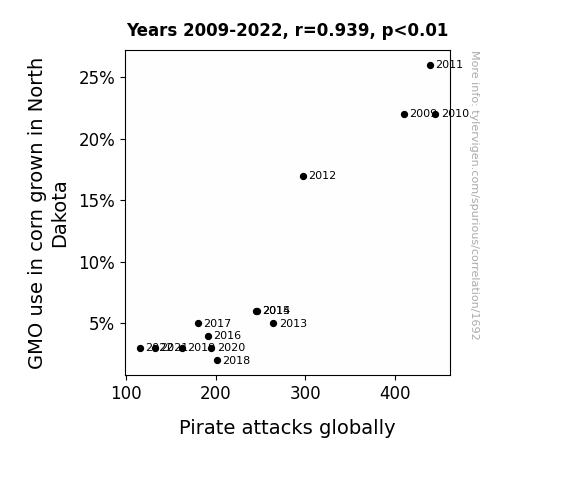 GMOs, corn, North Dakota, pirate attacks, correlation, USDA, Statista, GMO corn production, correlation coefficient, p-value, 2009-2022, global pirate attacks