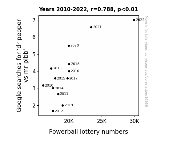 This means 62% of the change in the one variable (i.e., Powerball lottery numbers) is predictable based on the change in the other (i.e., Google searches for 'dr pepper vs mr pibb') over the 13 years from 2010 through 2022.
