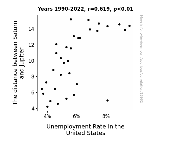 This means 38.3% of the change in the one variable (i.e., Unemployment Rate in the United States) is predictable based on the change in the other (i.e., The distance between Saturn and Jupiter) over the 33 years from 1990 through 2022.