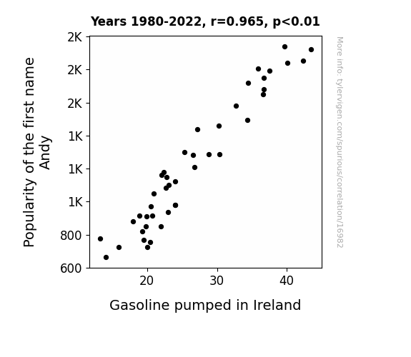 This means 93.1% of the change in the one variable (i.e., Gasoline pumped in Ireland) is predictable based on the change in the other (i.e., Popularity of the first name Andy) over the 43 years from 1980 through 2022.