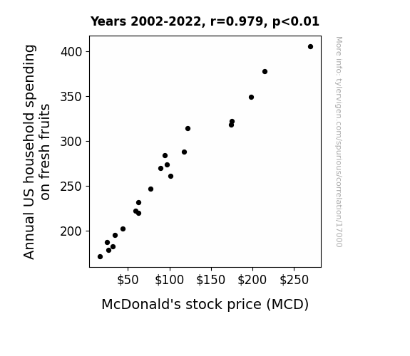 This means 95.8% of the change in the one variable (i.e., McDonald's stock price (MCD)) is predictable based on the change in the other (i.e., Annual US household spending on fresh fruits) over the 21 years from 2002 through 2022.
