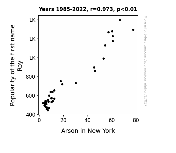 This means 94.7% of the change in the one variable (i.e., Arson in New York) is predictable based on the change in the other (i.e., Popularity of the first name Roy) over the 38 years from 1985 through 2022.