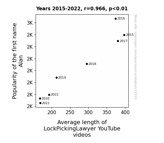 This means 93.3% of the change in the one variable (i.e., Average length of LockPickingLawyer YouTube videos) is predictable based on the change in the other (i.e., Popularity of the first name Alan) over the 8 years from 2015 through 2022.