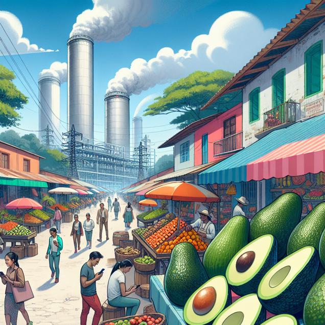 Prompt: Generate a concept art image of a vibrant marketplace in Panama. The bustling scene depicts a row of colorful fruit stalls with ripe avocados stacked high on the counters. Nearby, a towering biomass power plant hums with activity, billowing steam into the clear blue sky. People are seen excitedly searching on their smartphones for "avocado toast" recipes, creating a buzz of digital activity amidst the traditional backdrop. The depiction should include only scenes, people, and objects, it should not include text or speech bubbles.