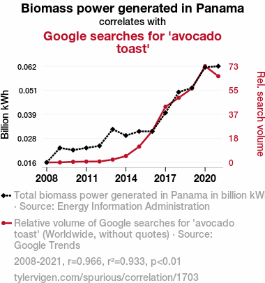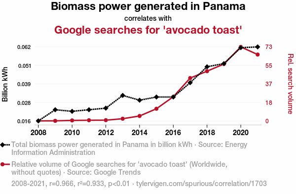 This means 93.3% of the change in the one variable (i.e., Google searches for 'avocado toast') is predictable based on the change in the other (i.e., Biomass power generated in Panama) over the 14 years from 2008 through 2021.