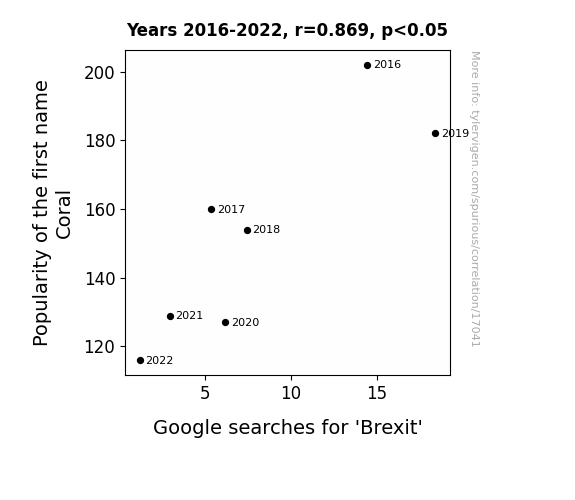 This means 75.6% of the change in the one variable (i.e., Google searches for 'Brexit') is predictable based on the change in the other (i.e., Popularity of the first name Coral) over the 7 years from 2016 through 2022.