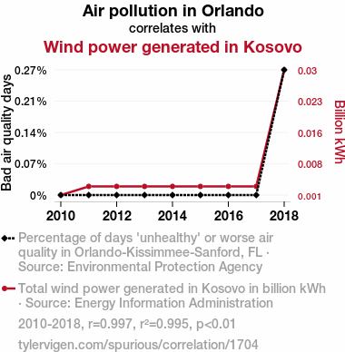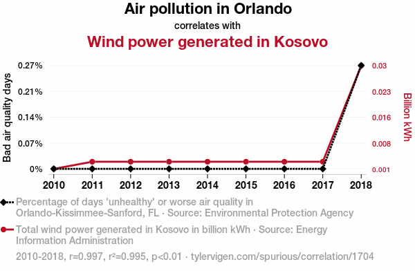 This means 99.5% of the change in the one variable (i.e., Wind power generated in Kosovo) is predictable based on the change in the other (i.e., Air pollution in Orlando) over the 9 years from 2010 through 2018.