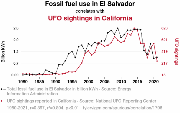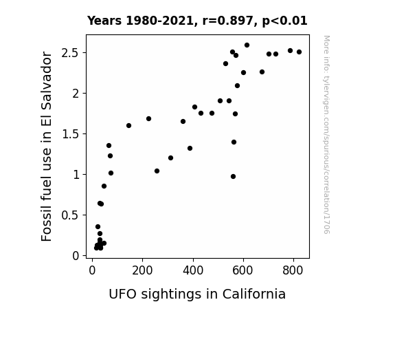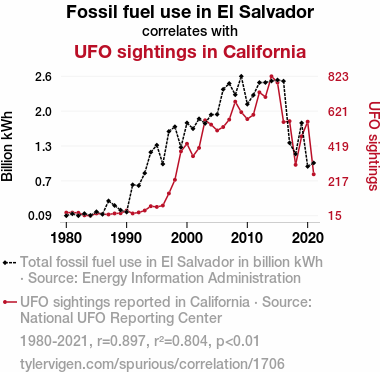- The spurious research paper: Fueling the Unidentified: Investigating the Correlation Between Fossil Fuel Use in El Salvador and UFO Sightings in California