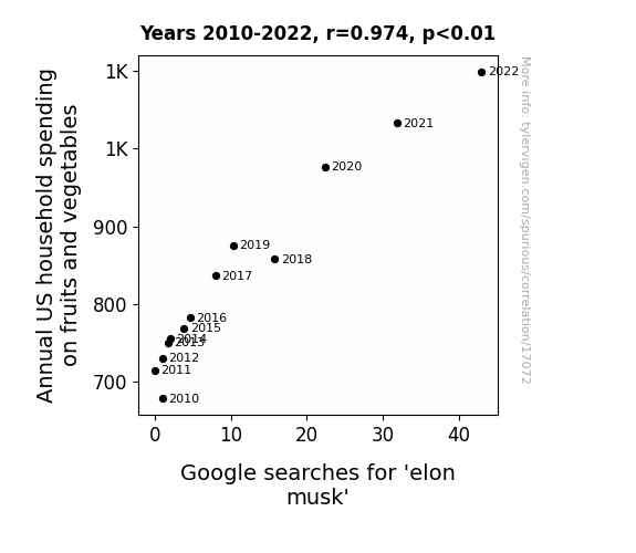 This means 94.8% of the change in the one variable (i.e., Google searches for 'elon musk') is predictable based on the change in the other (i.e., Annual US household spending on fruits and vegetables) over the 13 years from 2010 through 2022.