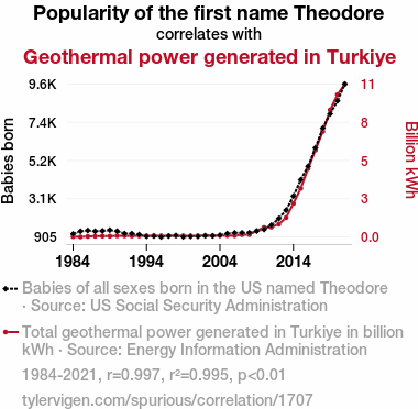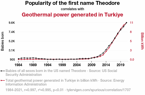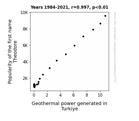 This means 99.5% of the change in the one variable (i.e., Geothermal power generated in Turkiye) is predictable based on the change in the other (i.e., Popularity of the first name Theodore) over the 38 years from 1984 through 2021.